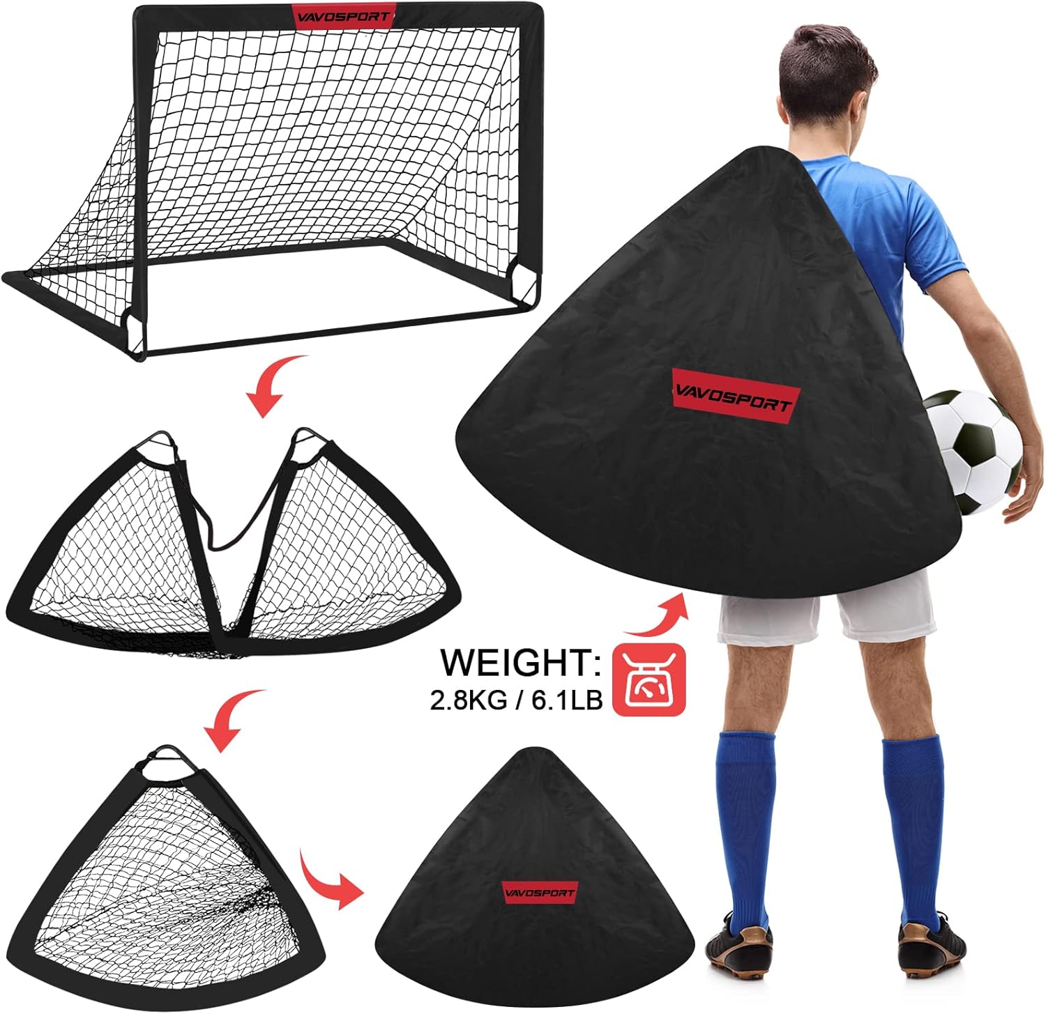 Complete and Valuable Soccer Goals Set – The VAVOSPORT Soccer Net Set is the most complete soccer set on the market. It has 2 easy-fold kids’ soccer goals, 1 std size 3 soccer ball, 1 inflation pump, 10 cones, 8 U-shaped heavy-duty ground nails and 1 carrying bag. One soccer set for everything you need to develop your child into a little athlete, allowing your kids to have their “own” net to score a goal on!