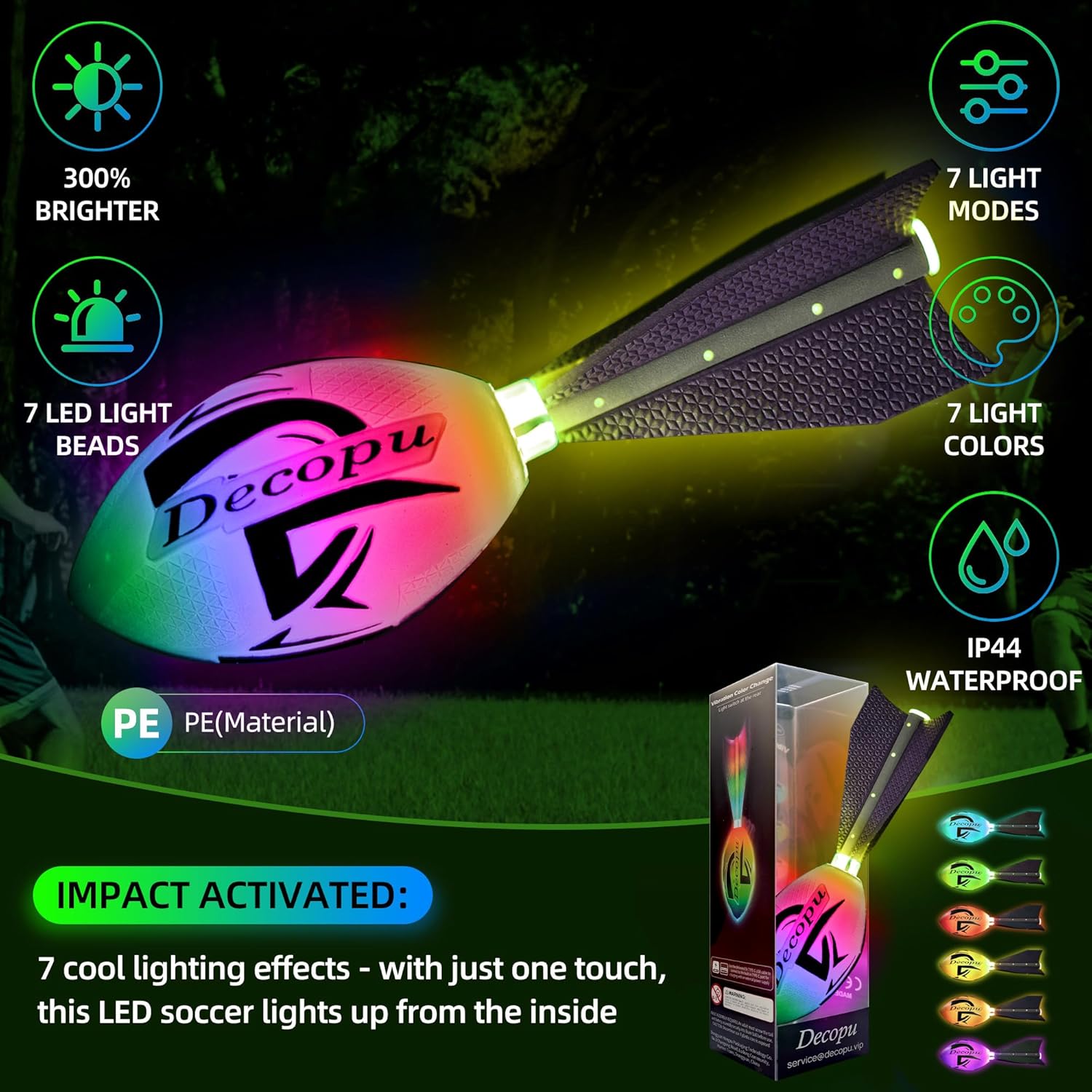 7 RGB LEDs SUPER BRIGHT:Our ligh-up soccer ball has a total of 7 LEDs that work for 4-5 hours even on the dark nights, at playgrounds, on beaches, or even on camps. When not in use, the lights automatically turn off after 30 seconds, saving you money by using rechargable batteries inside